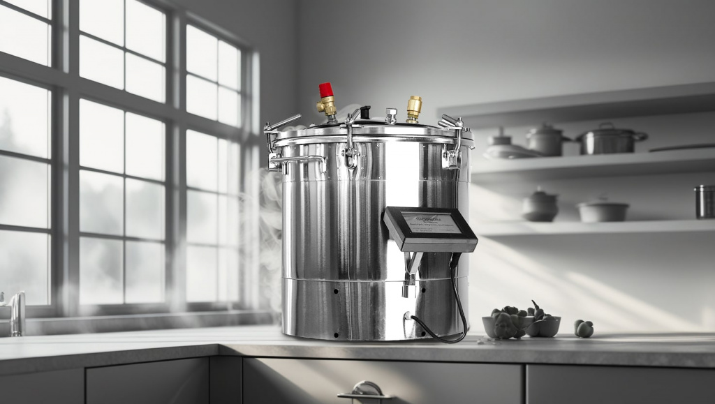 Объём 22 литра позволяет загружать до 18 банок по 0,5 л или 6 банок по 1 л за один цикл. Удобно работать как со стандартными стеклянными банками, так и с жестяными консервными банками и реторт-пакетами. Это даёт возможность делать универсальные заготовки: от мясных тушёнок до соков, овощных салатов и компотов.